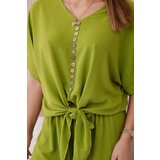 An Italian ensemble with a blouse with a tie at the front and wide legs is an ideal choice for women who appreciate comfort and style in one. The blouse tied at the front with buttons adds a delicate femininity. The wide legs are made of soft and pleasant to the touch material and provide freedom of movement and wearing comfort. This complete set can be worn on various occasions both at work and on a date or meeting with friends. Combined with elegant footwear and accessories such as a handbag or jewelry, it creates a stylish and fashionable outfit. The size is universal and will be suitable for women in size S, M or L.MADE IN ITALYMaterial composition:95% Polyester,5% ElastaneBlouse dimensions:Armpit width: 61 cmTotal length: 61 cmWidth at the bottom: 43 cmTrouser sizes:Waist width: 35 cm /stretched: 50 cmTotal length: 104 cmInside leg length: 71 cmLeg width: 32 cm